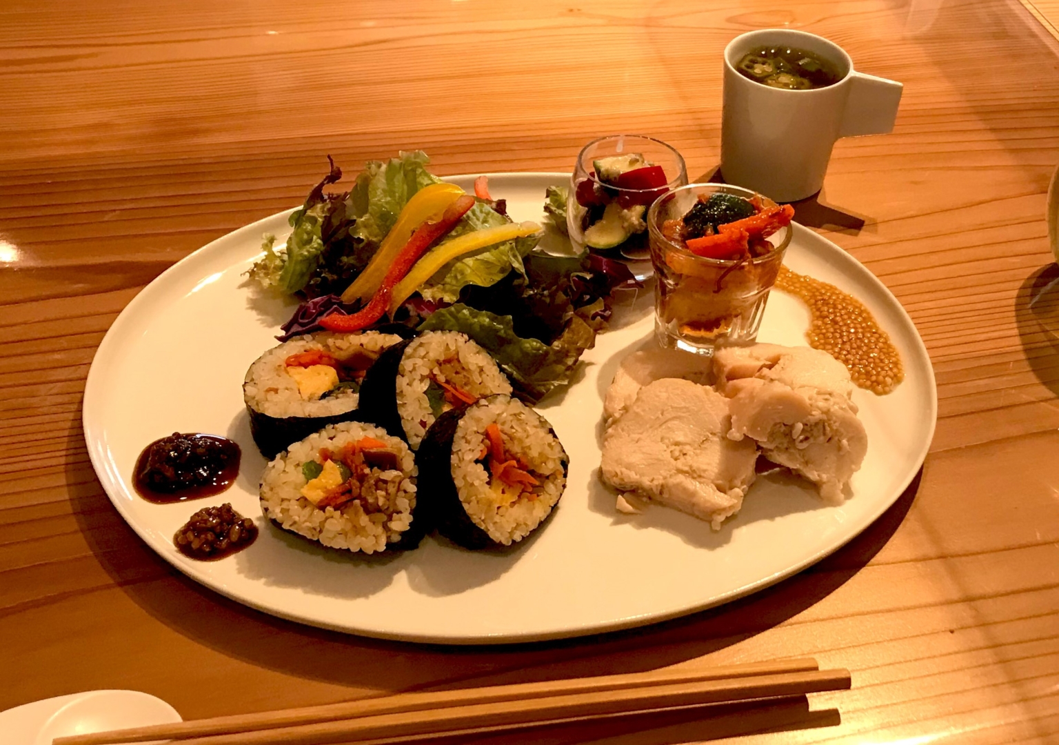 キンパは、野菜の甘味と醤油麹の旨味が合わさり、玄米の食感も相まって